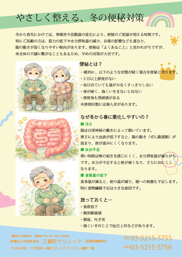 やさしく整える、冬の便秘対策 お知らせ 2026.03.23 冬から春先にかけては、寒暖差や活動量の変化により、便秘のご相談が増える時期です。「お腹ひねり体操」と「『の』の字マッサージ」で、無理のない便秘対策を続けましょう。