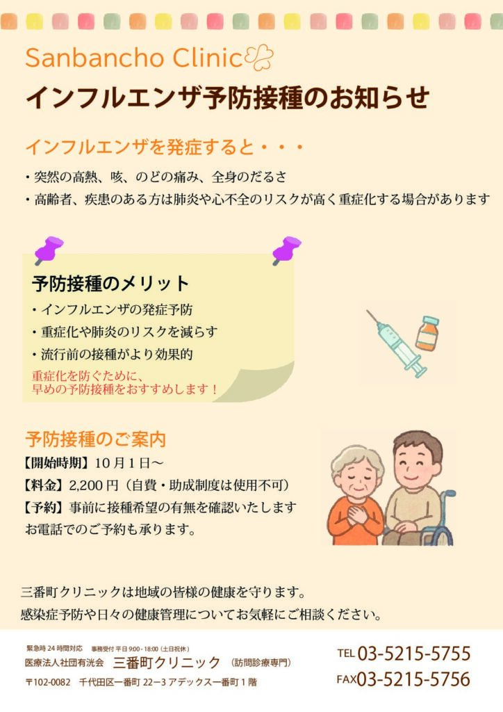 インフルエンザ予防接種のお知らせ お知らせ 2025.10.03 三番町クリニックでは、2025年10月1日より、インフルエンザの予防接種を開始しています。重症化を防ぐために、早めの予防接種をおすすめします!