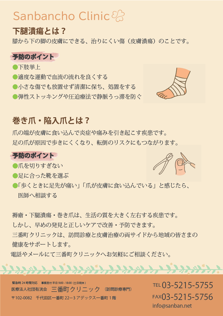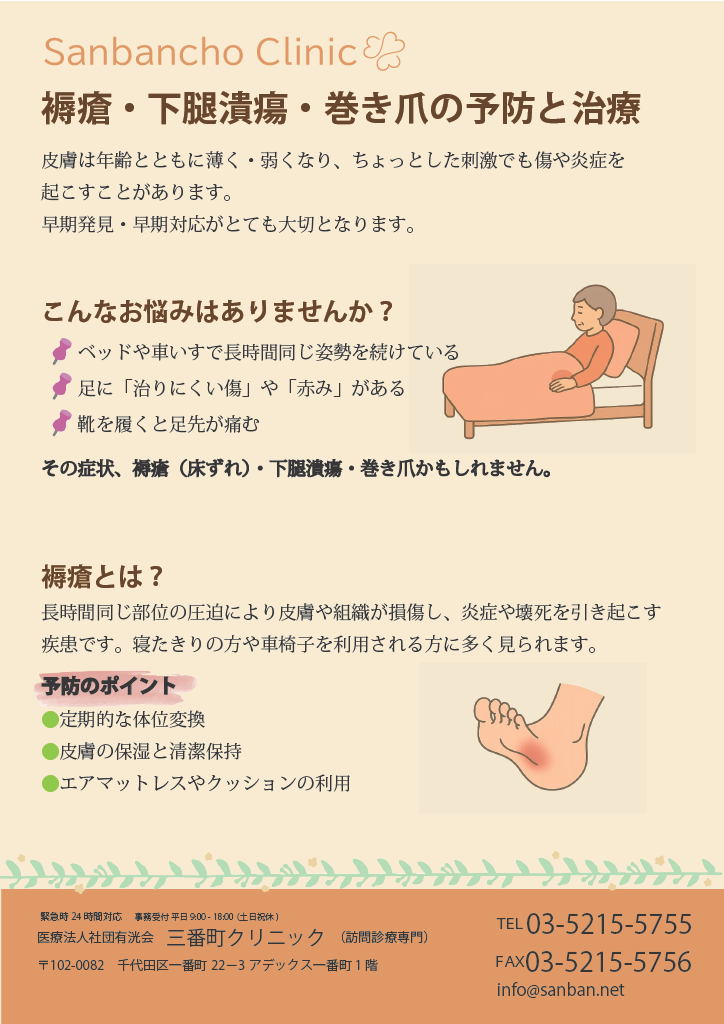 褥瘡・下腿潰瘍・巻き爪の予防と治療 お知らせ 2025.11.11 褥瘡・下腿潰瘍・巻き爪は、生活の質を大きく左右する疾患です。しかし、早めの発見と正しいケアで改善・予防できます。 お気軽にご相談ください。
